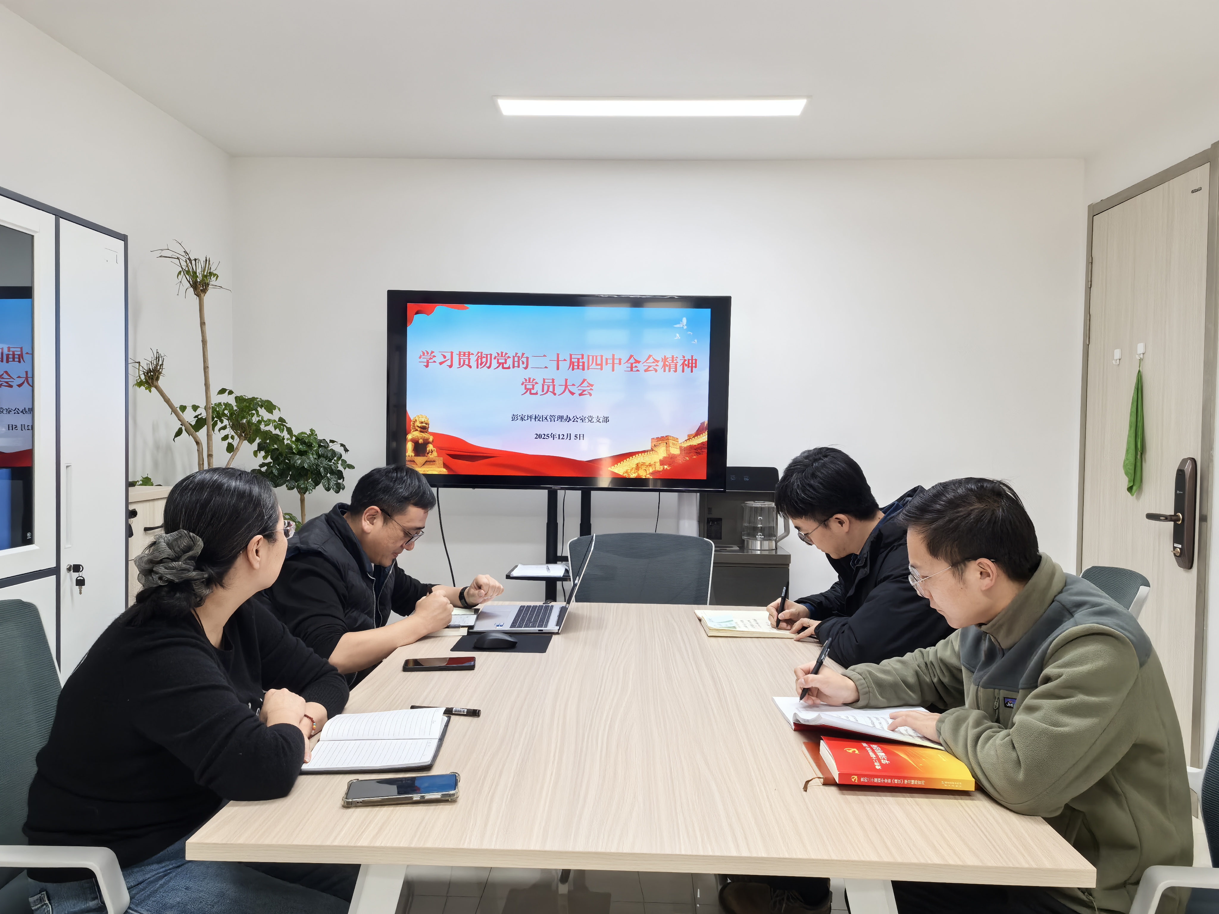 近日,彭家坪校区管理办公室党支部通过“三会一课”组织全体党员专题学习党的二十届四中全会精神,精读《党的二十届四中全会〈建议〉学习辅导百问》重点内容,并持续巩固中央八项规定精神学习成果,着力强化作风建设。